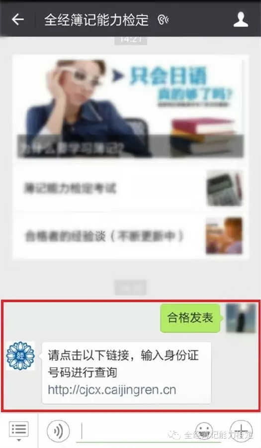 方式二:关注全经官方微信公众号——“全经簿记能力检定”进行查询是否合格。(查询方法详见下文)